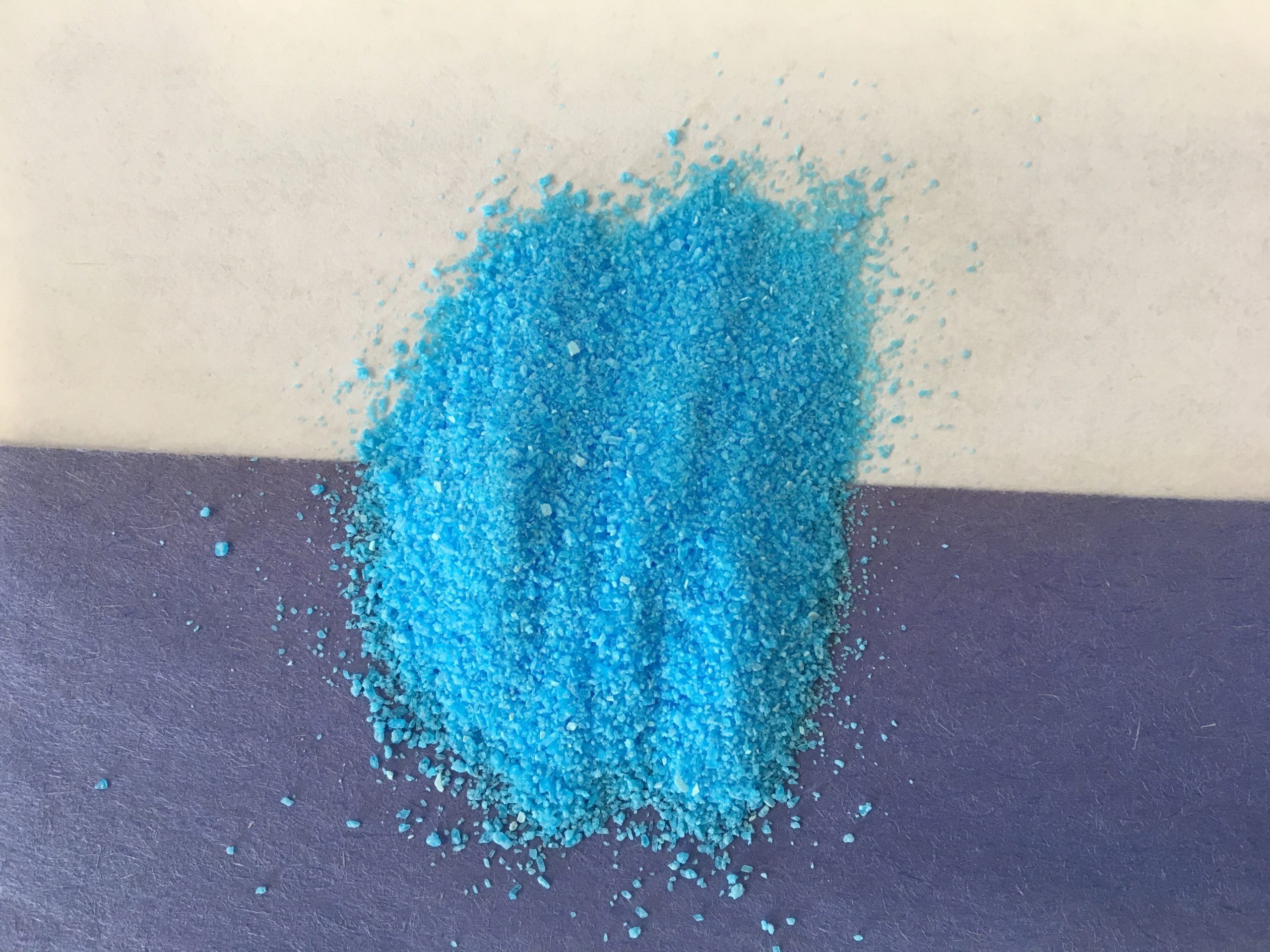 Copper Sulfate powder (Fine 200, Fine 100, Fine 30) contain an anti-caking agent (e.g. Magnesium carbonate, calcium carbonate); larger sizes (Fine 20 – Large) do not. Anti-caking agent creates a film on fine 30 crystals.