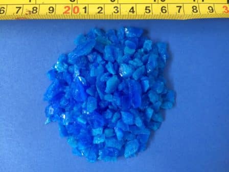 Copper Sulfate powder (Fine 200, Fine 100, Fine 30) contain an anti-caking agent (e.g. Magnesium carbonate, calcium carbonate); larger sizes (Fine 20 – Large) do not. Anti-caking agent creates a film on fine 30 crystals.